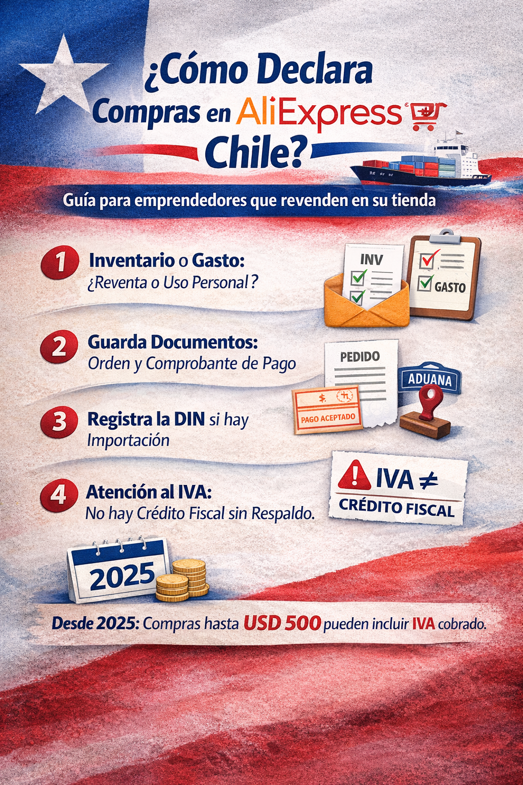 Respuesta directa: sí puedes declararlas, pero debes hacerlo con criterio. Lo principal es entender 3 cosas: (1) AliExpress normalmente no emite DTE chileno, (2) si compras para revender no es “gasto”, suele ser inventario/costo, y (3) desde el 25 de octubre de 2025 cambió el IVA para compras internacionales de hasta USD 500