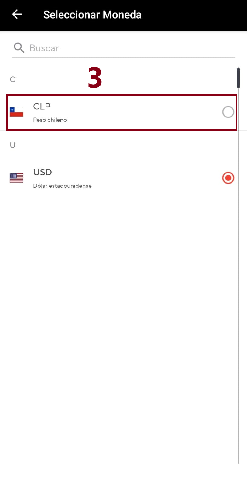Desplázate por la lista de monedas hasta encontrar “CLP” o “Peso Chileno” y haz clic en ella para seleccionarla como tu moneda preferida.